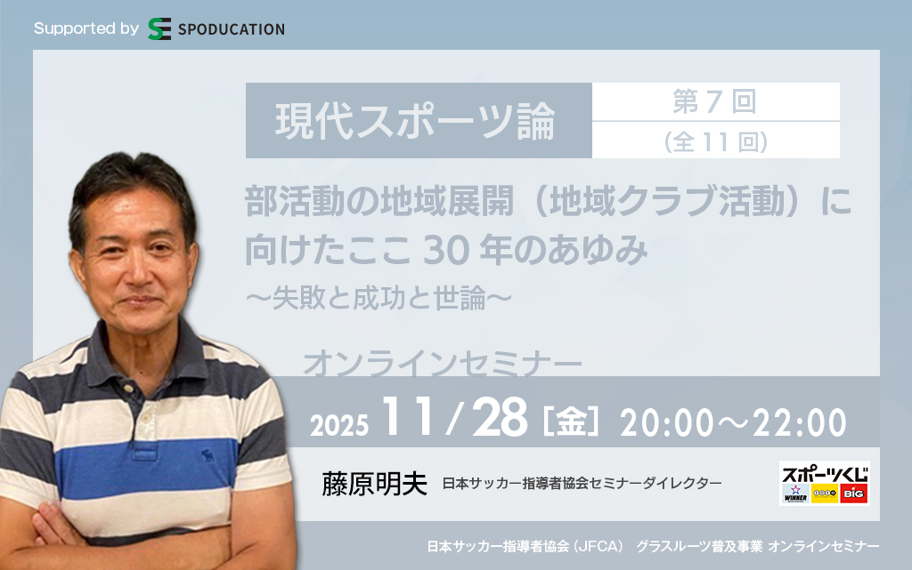 ★11/28★日本指導者協会(JFCA)グラスルーツ普及事業オンラインセミナー現代スポーツ論 第7回 / 全11回部活動の地域展開(地域クラブ活動)に向けたここ30年のあゆみ~失敗と成功と世論~